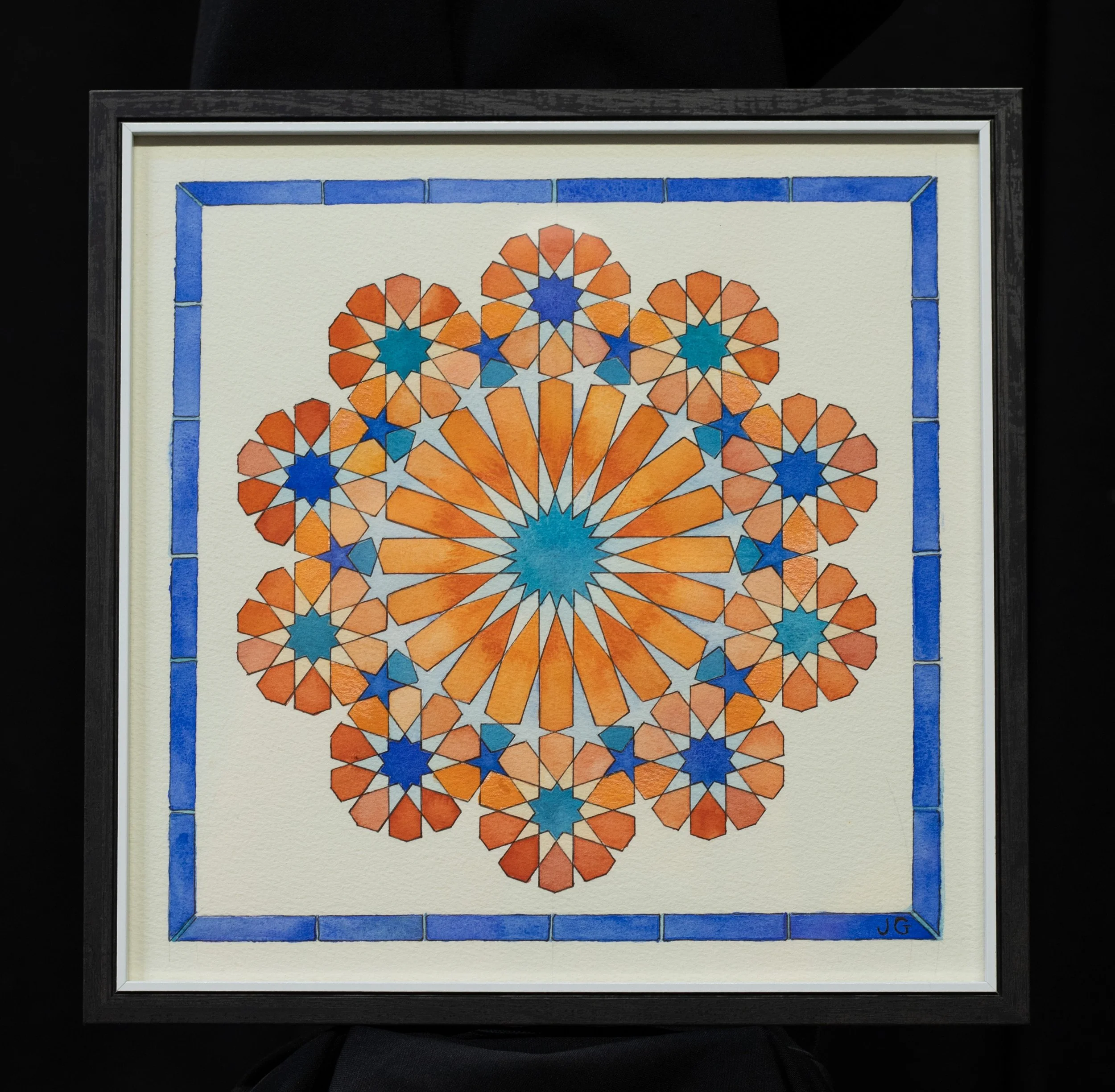 I’m an artist inspired by traditional geometric designs, I construct a pattern with a ruler and a compass and then with the watercolours I create the “soul” of the painting. This is a classic 10 fold rosette pattern, examples can be seen in Morocco and the Alhambra.